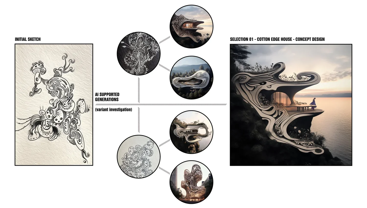COTTON EDGE HOUSE - from handsketch to AI generated images