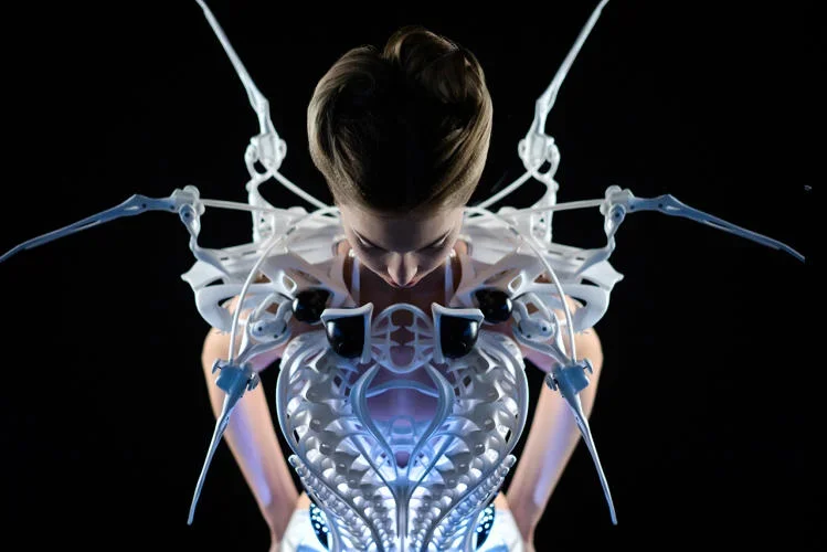 Upon closer inspection, the dress reveals a captivating contrast. While it may initially appear as a high-tech, almost soulless creation, intricate "braided" details and delicate elements unveil its artistic essence. The exoskeleton-type dress was digitally crafted in collaboration with Philip Wilck and Utopia Blu, making its debut at the 2015 CES in Las Vegas.